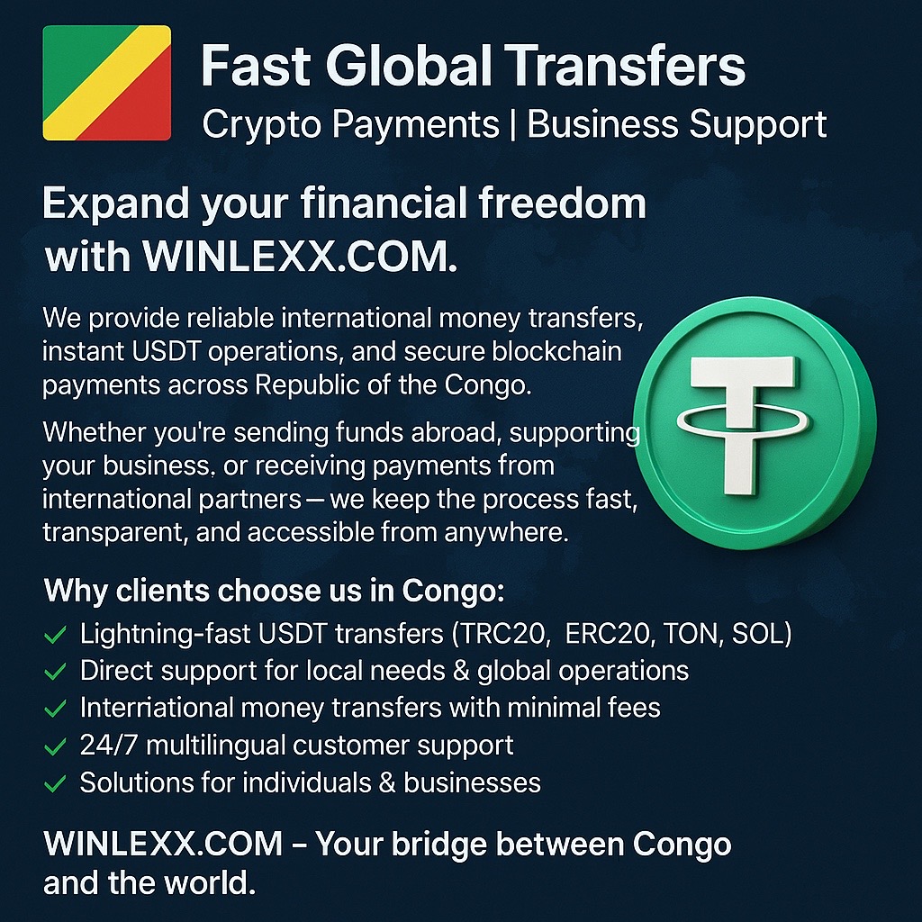 Winlexx provides a complete ecosystem of international USDT transfers, corporate services, and digital financial solutions across the Republic of the Congo. Our platform ensures security, speed, and transparency for individuals and businesses seeking reliable international payments.